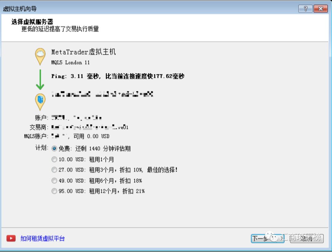 注册虚拟服务器,是由迈达克提供的离当前交易商服务器较近的vps服务器,小编本地登陆账号,延迟为180毫秒左右,如果使用了迈达克推荐的伦敦服务器,延迟将降为3毫秒左右(见下图)。