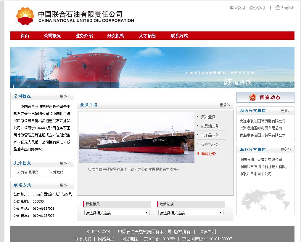 中国联合石油有限责任公司是中国石油天然气集团公司和中国中化集团公司共同出资组建的石油外贸公司,由中国石油天然气集团公司经营管理。公司拥有原油、成品油进出口经营权和原油、成品油境外期货业务许可证。