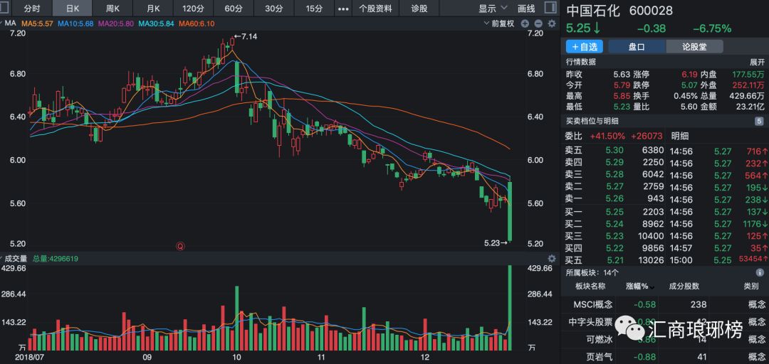 今天A股市场被中石化震动了,市场上一则大消息,让中石化这个巨无霸的股价瞬间跳水,截至27日下午收盘,中石化暴跌近7%,收报5.25元/股,A股市值没了460亿。