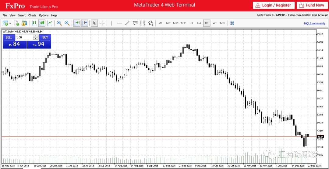 不过9月底至今,全球油价走出了为期三个月的跌势,布油近三个月的跌幅达到36%(下图为外汇经纪商FxPro网页版原油日线数据)。