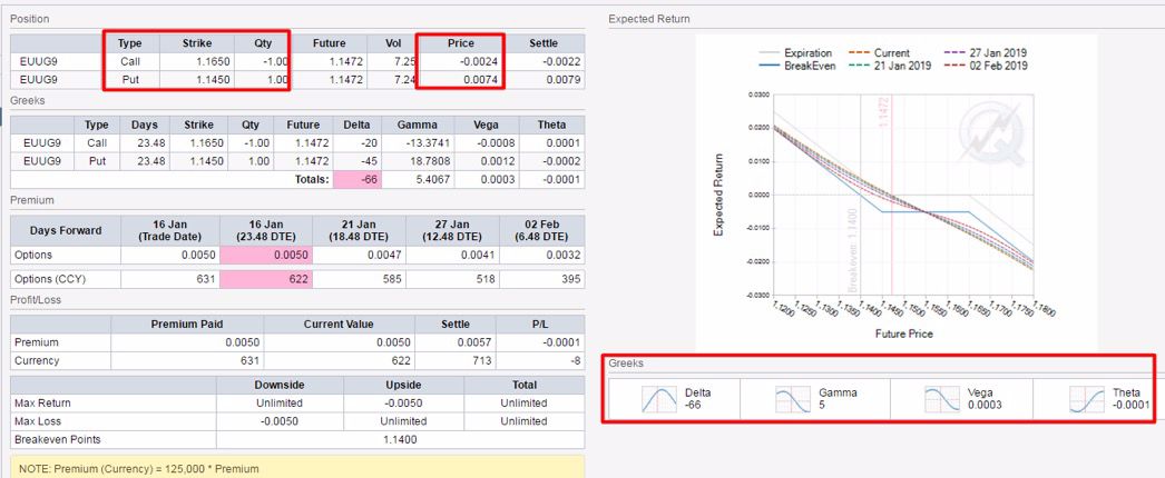 考虑到欧元区面临巨大经济和政治方面的不确定性,欧元在持续横盘2个月后大概率将向下突破收敛三角形。因此,期权策略上,买入近月平值put,同时为了降低买put的成本,在上方阻力位处卖出虚值call。虚值call执行价选择为2019.1.9的高点,期权持仓量指标也显示,1.16call处聚集着大量持仓量,表明是重要阻力位(图3),与2019.1.9高点阻力位共振。该期权组合具体指标见图4,欧元周期权合约细则见表1。