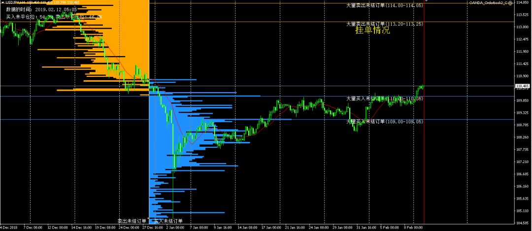 可以看到零售客户在这里的多空持仓处于(多头:54%,空头:46%),大量用户在104.00/113.20挂空单卖出,109/110挂多单买入。