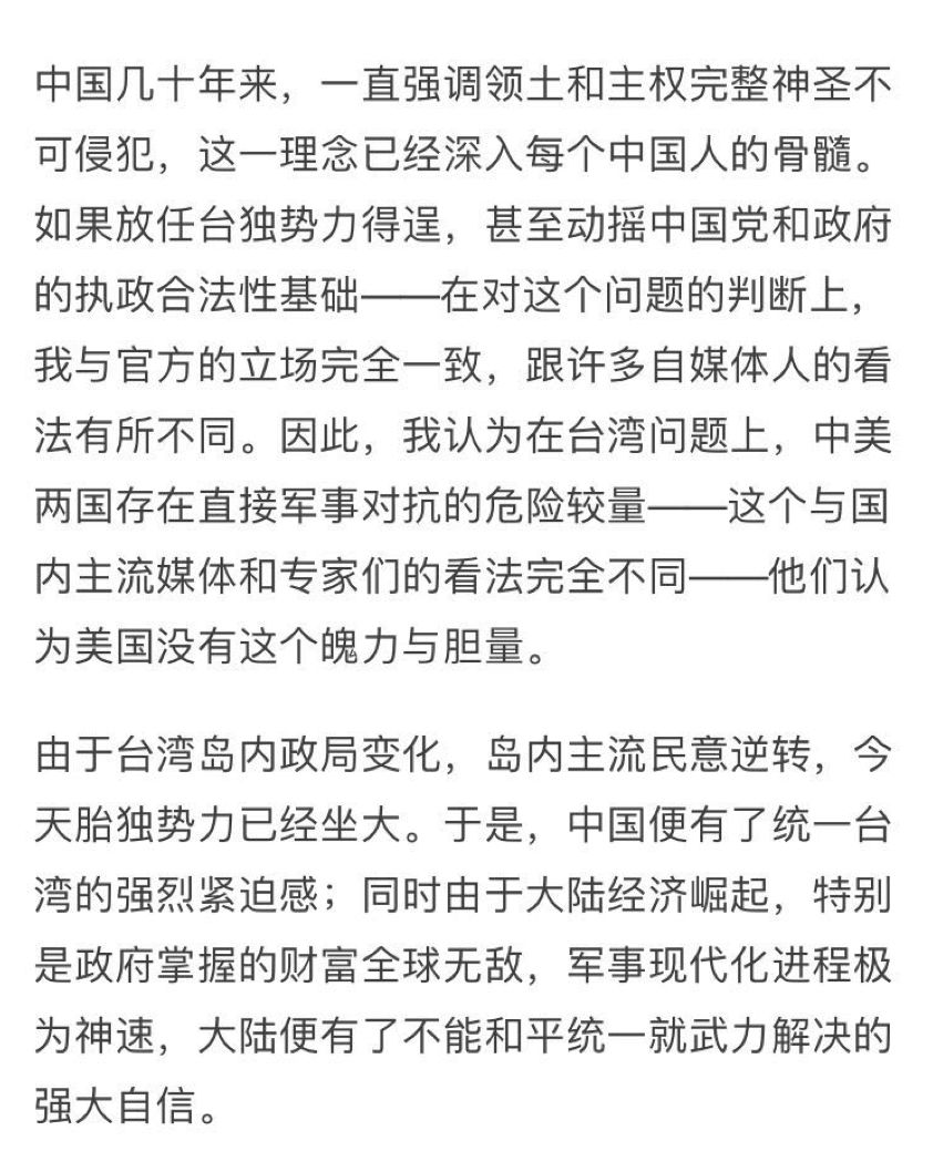 在台湾问题上,中美确实存在直接军事对抗的巨大风险,甚至不排除美国纵容台独势力冒险,从而提前与中国军事摊牌。