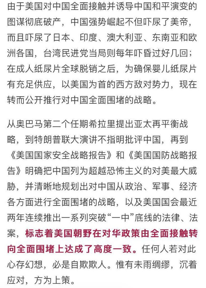 美国等西方势力,本来是想通过与中国的全面接触,来诱惑中国和平演变,但万万没想到,刚刚进入小康还谈不上富裕的中国,已经牛气冲天,不仅大力加强内部管制,高调发展军事力量,而且竟然要把自己的治理模式推向全球!特朗普上台后,在多次公开大骂历届美国总统都是大傻逼的同时,发誓自己绝对不再做这样的傻逼了。这是中美关系出现重大转折的根源。