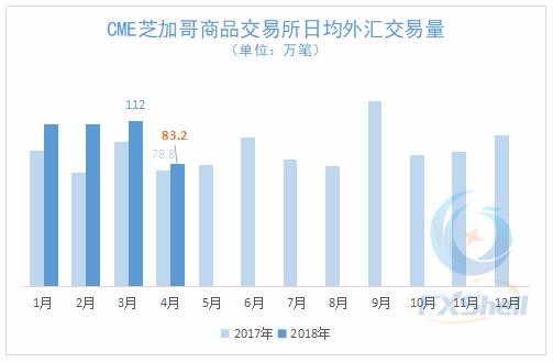 据汇讯网FXShell追踪统计,2018年4月,美国衍生品交易市场芝加哥商品交易所(CME)的日均外汇交易量降至83.2万笔,未能延续一季度的亮眼成绩,环比减少25.7%,同比增加5.6%.