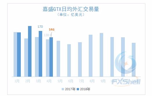 2018年4月,嘉盛集团旗下机构外汇交易平台GTX的总交易量约为3,065亿美元;日均外汇交易量约为146亿美元,环比减少14%,同比略有增加。(3月嘉盛GTX日均外汇交易量环比下降10%)