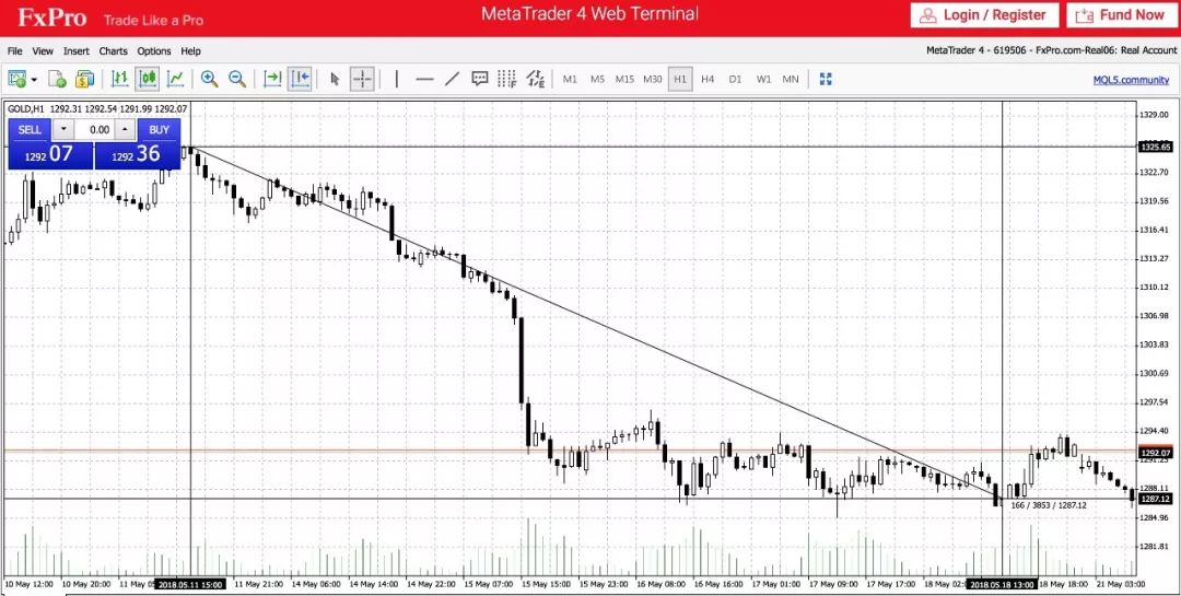 黄金波动大,振幅剧烈,行情启动快,力度强,适合趋势交易。以上周的黄金暴跌为例,短时间内黄金就跌去了40美金。从FxPro浦汇独有的 WebTrader 交易平台可以清晰看到。