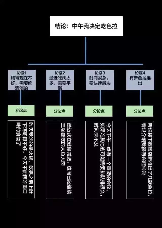 当阐述完核心观点之后,接下来需要进行解释,即“为什么这么做”。就像写论文一样,首先是核心论点,接下来是支持核心论点的分论点,然后是二级分论点,依次向下排列。