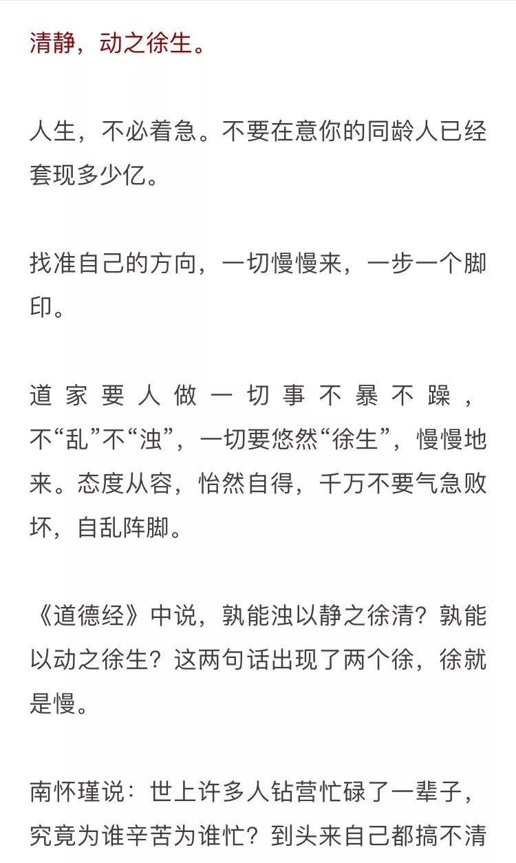 现代社会,几乎每 一个人都是天天分秒必争,忙忙碌碌,事事穷紧张,不知是为了什么,在拼命玩命。这显然是与道家“动之徐生”的精神背道而驰的。
