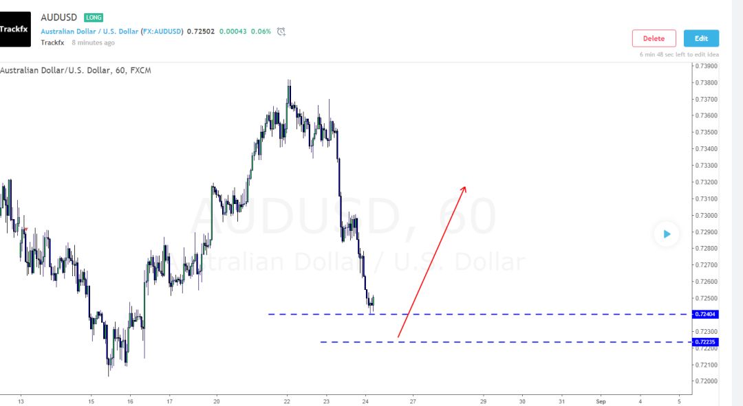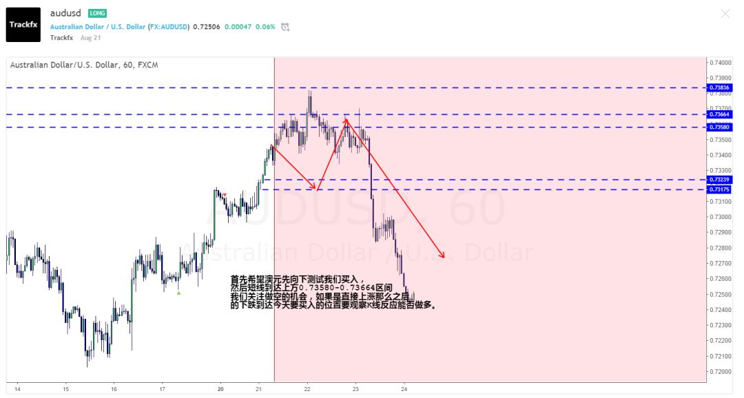 澳元:之前的做空布局,完成了一段美妙的下跌,并且图中也提醒到,如果是直接上涨后的下跌,买入要观察K线。今天关注0.72404-0.72235的支撑区间。