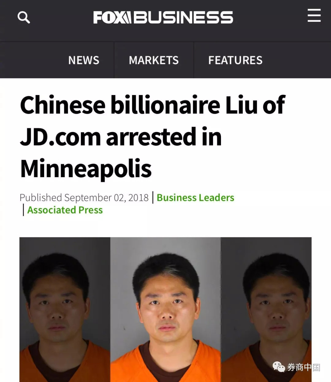 随后,纽约时报、美联社、路透、华尔街日报等各大海外媒体纷纷报道了这一消息,刘强东被拘捕的照片也被公布出来。
