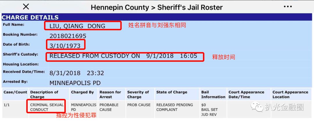 毕竟法治国家,一个小城警察局抓人及保释的记录都能在网上公开查询,于是有网友扒出了刘强东美国警局半日游的官方记录:
