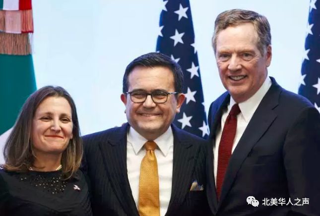 加拿大外交部长(左)、墨西哥商务部部长(中)、美国贸易代表(右)合影