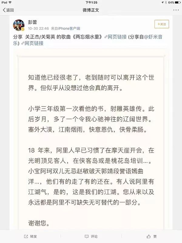 10月30日晚,彭蕾也发布微博追忆金庸,她写道:“知道他已经很老了,老到随时可以离开这个世界。但似乎从没想过他会真的离开。小学三年级第一次看他的书,射雕英雄传。此后岁月,多了一个令我心驰神往的辽阔世界。塞外大漠,江南烟雨,快意恩仇,侠骨柔肠。18年来,阿里人早已习惯了在摩天崖开会,在光明顶见客人,在侠客岛或是桃花岛培训..……小宝阿珂双儿无忌赵敏破天郭靖段誉语嫣曲洋...他们有的走了有的还在。有人说阿里有江湖气,是的,这是我们的江湖。您从来以及永远都是阿里不可缺失无可替代的一部分。谢谢您。”