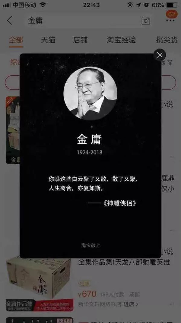 与此同时,10月30日晚,手机淘宝在App客户端悼念金庸,用户搜索“金庸”时,淘宝会弹出金庸先生的照片,并配上《神雕侠侣》中的一段话:“你瞧这白云聚了又散,散了又聚,人生离合,亦复如斯”。