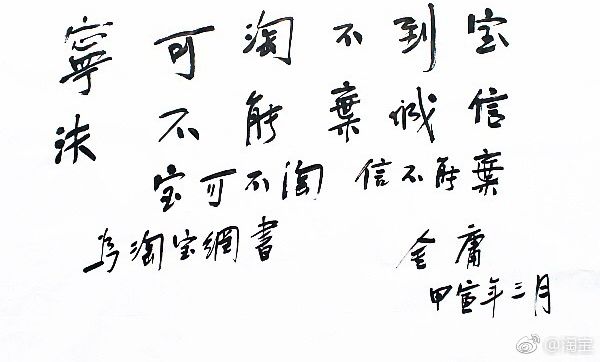 阿里在社交媒体账号晒出满满回忆:2004年金庸到访淘宝办公室,马云、彭蕾、金建行等阿里“十八罗汉”请金庸题字,金庸写道:“宁可淘不到宝,决不能弃诚信。宝可不淘,信不能弃。”