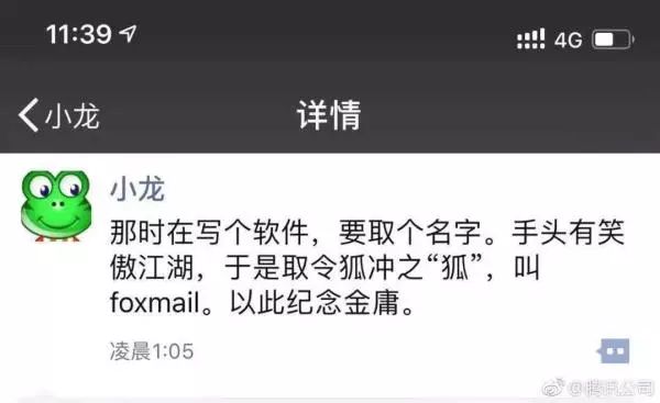 10月31日凌晨,“微信之父”、腾讯集团高级执行副总裁兼微信事业群总裁张小龙在自己的朋友圈中追思,自己曾经开发的Foxmail邮箱的取名,正是受到《笑傲江湖》的启发。“取令狐冲之‘狐’,叫foxmail。以此纪念金庸。”