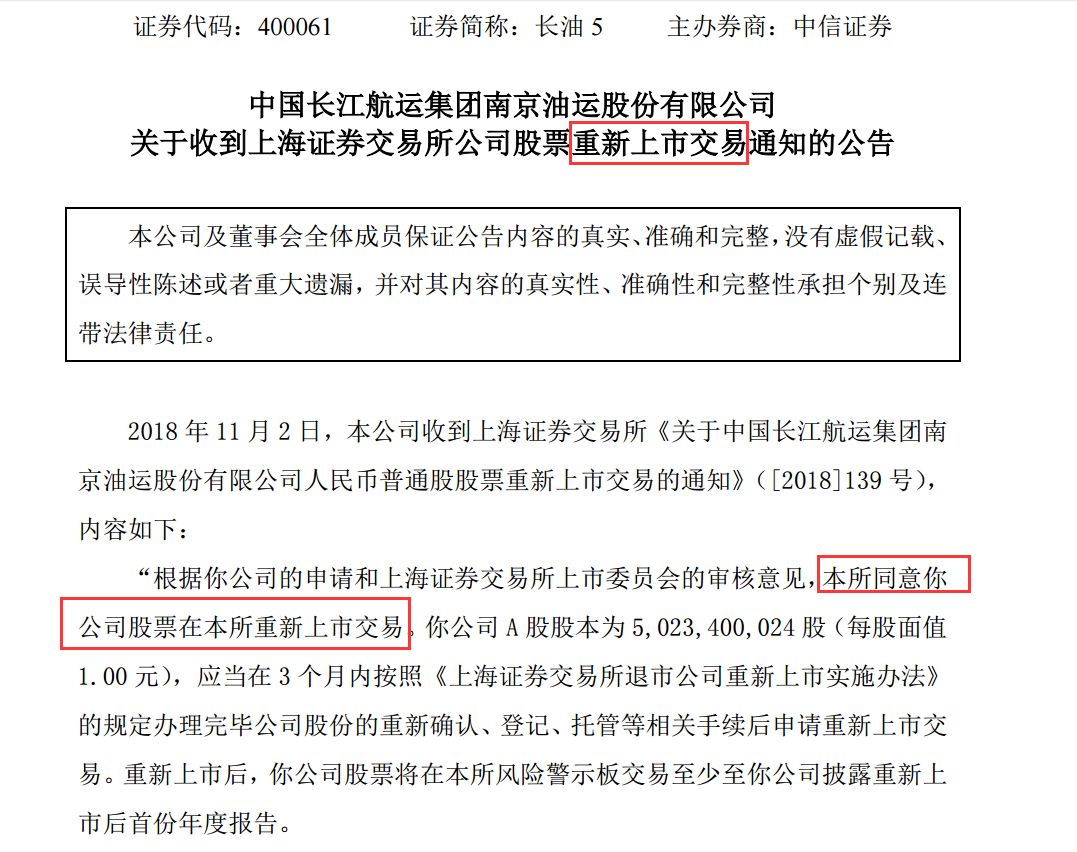 股转系统公司长油5(400061)今日晚间发布公告称,收到上交所对于公司股票重新上市交易通知。
